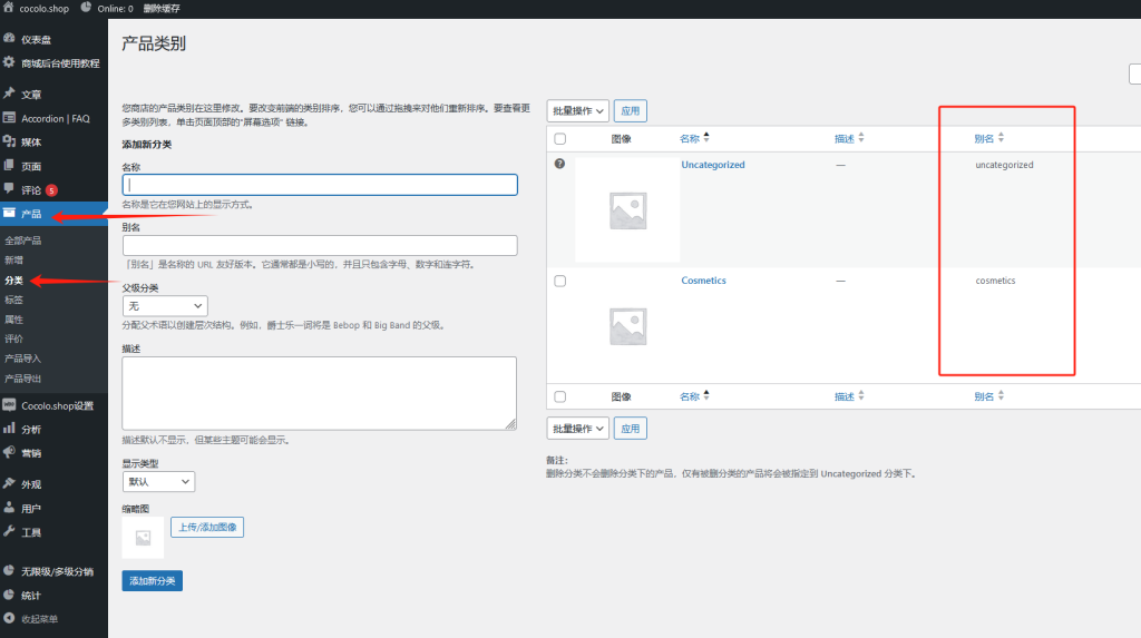 2.在简码方框内填入以下简码:简码limit=”9999″ 9999是页面展示的产品数量, columns=”4″ 4是页面分4列展示,orderby=”id” order=”DESC” 产品以ID降序的形式排列,category=”cosmetics” cosmetics位置填入产品品类,产品可在以下路径找到(请查看图3. 产品 -> 分类-> 别名)下面找到你要挂载在页面的品类(此类代码可以在以下页面找到详细教程),最后保存页面即可